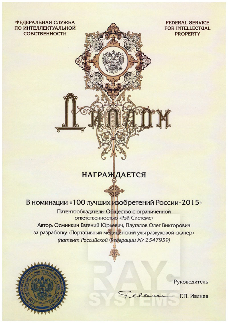Патентообладатель: общество с ограниченной ответственностью «Рэй Системс». Автор: Осминкин Е., Плуталов О. за разработку «Портативный медицинский ультразвуковой сканер».