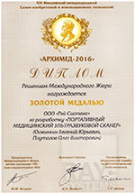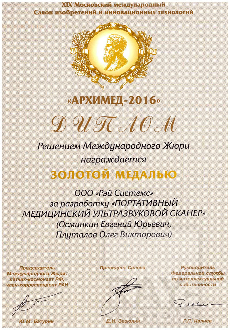 Решением международного жюри награждается золотой медалью «Рэй Системс» за разработку «Портативной медицинский ультразвуковой сканер».